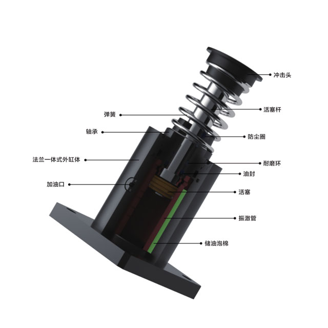 | 緩沖時液壓油流過多節流孔產生粘滯阻尼力,將沖擊能量轉化為熱能;回程時,機械彈簧將活塞桿復位;在緩沖過程中,蓄能海綿被擠壓的體積與活塞桿進入內缸體的體積一樣。 | ||||||||||||||||||||||||||||||||||||||||||||||||||||||||||||